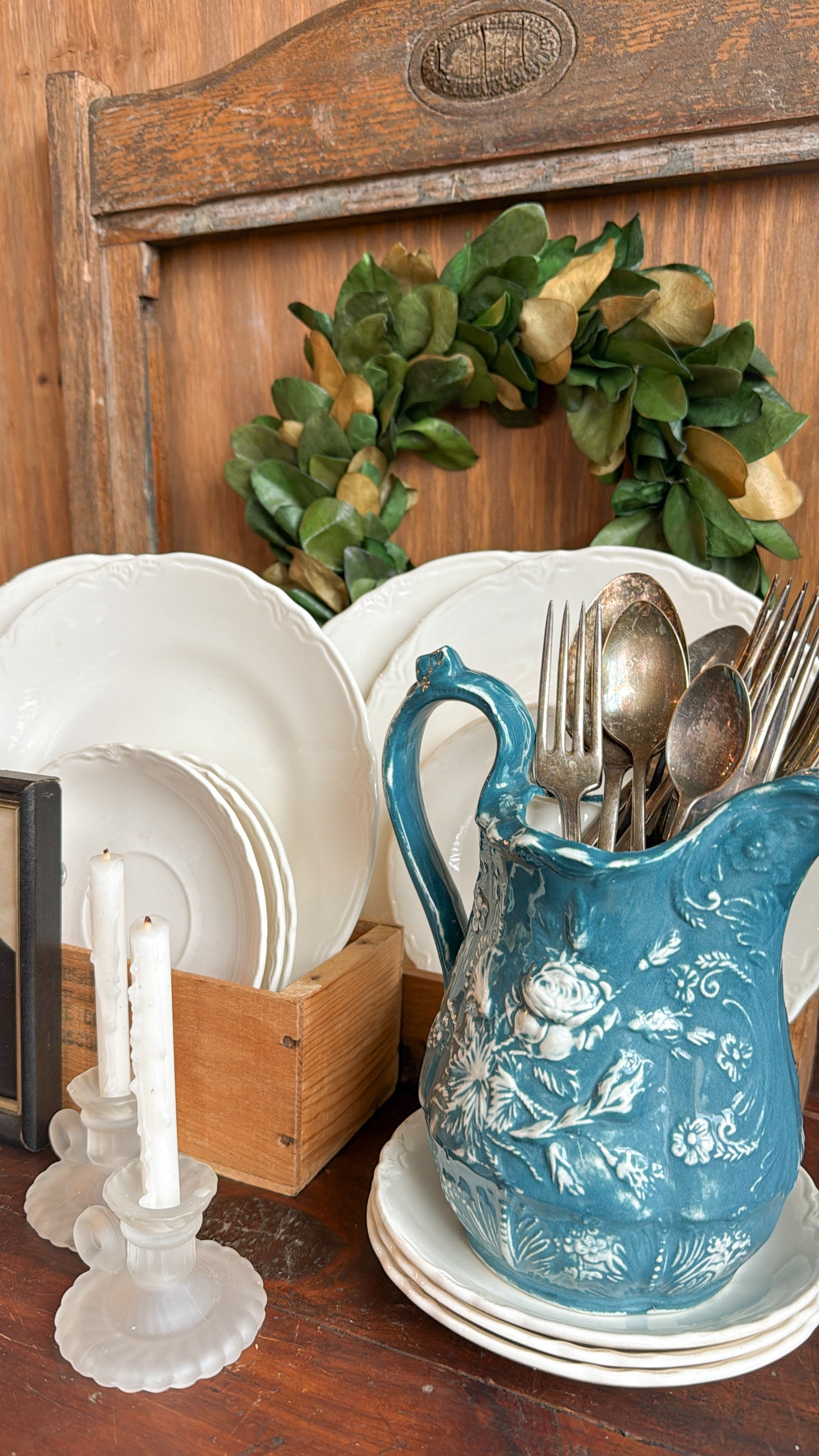 Vintage Blue Ceramic Floral Pitcher